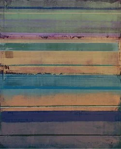 “I began painting the “Strata” series in the spring of 2007. The Strata paintings in this exhibit were completed while on a recent fellowship at the Virginia Center for the Creative Arts in Amherst, VA. The basic horizontal stripe compositions in these paintings were initially inspired by the abundant river views in the beach town where I live, but the end result more closely resembles a cross-section of earth or the strata found in rocks. The painting process itself is similar to an archeological dig. I apply multiple layers of paint, which are eventually sanded and scraped to reveal previously forgotten colors and textures. This method of painting retains an element of chance in an otherwise very structured format.”