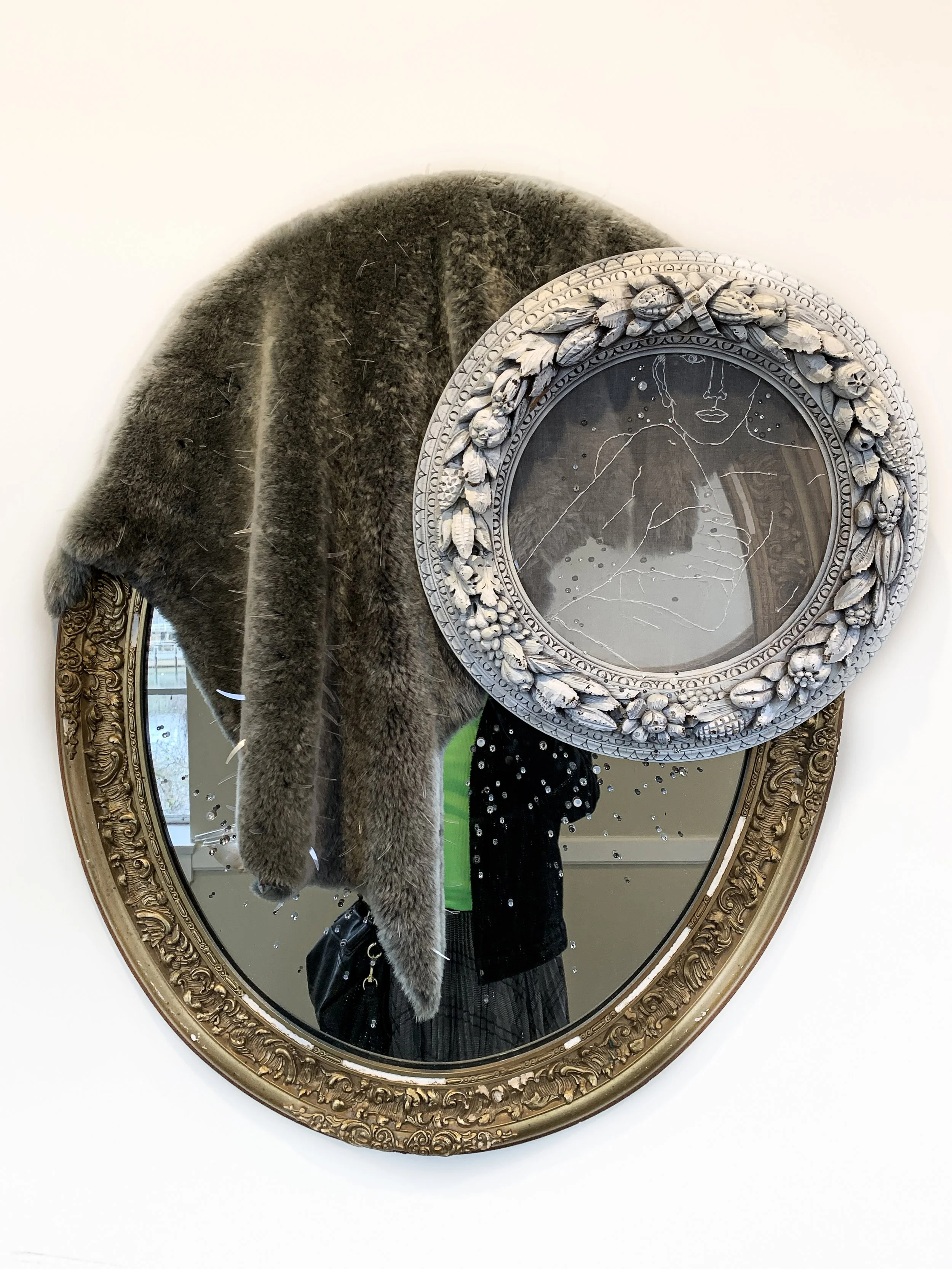 Michael-Birch Pierce, Eclipsing You Outshining Me, 2018, Hand embroidered fur on antique mirror, 22 x 24 inches, Courtesy of Quirk Gallery