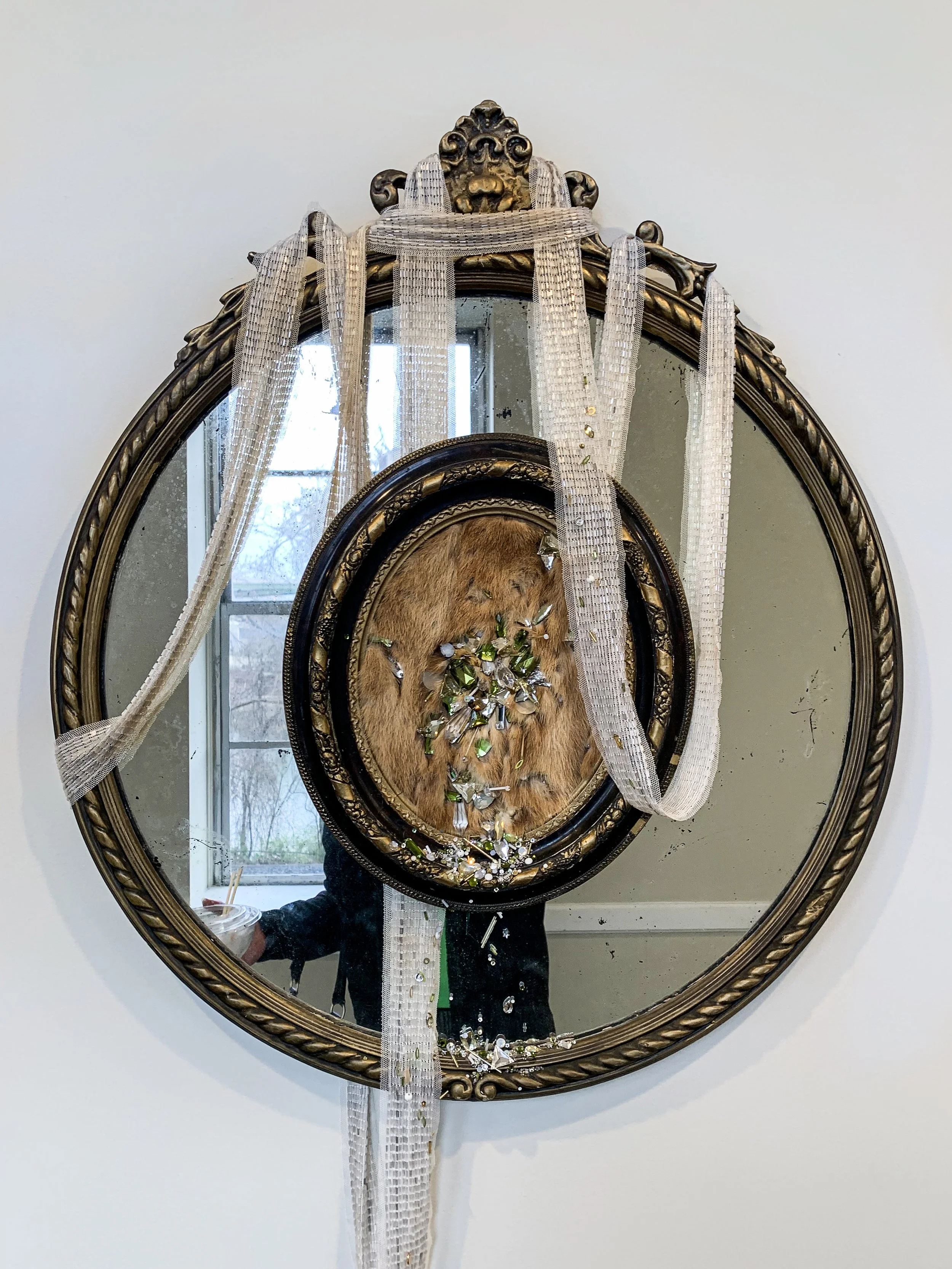 Michael-Birch Pierce, An Outpouring, 2017, Hand embellished mink fur and tulle ribbon with antique mirror and frame, 30 x 32 inches, Courtesy of