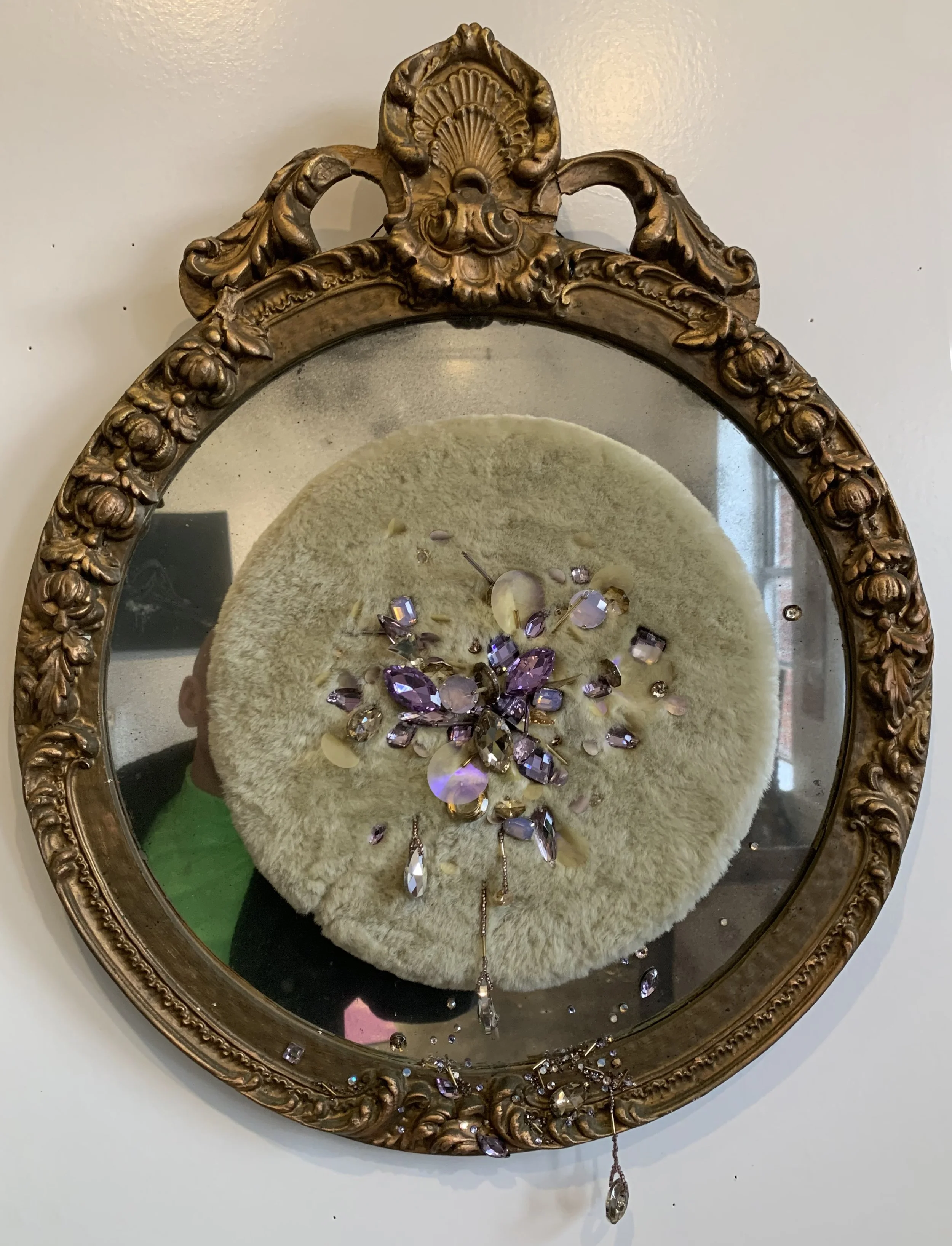 Michael-Birch Pierce, Just Be a Man About It, 2018, Hand Embroidered silk organza and fur with Swarovki crystals on antique mirror and frame, 30 x 36 inches, Courtesy of Quirk Gallery
