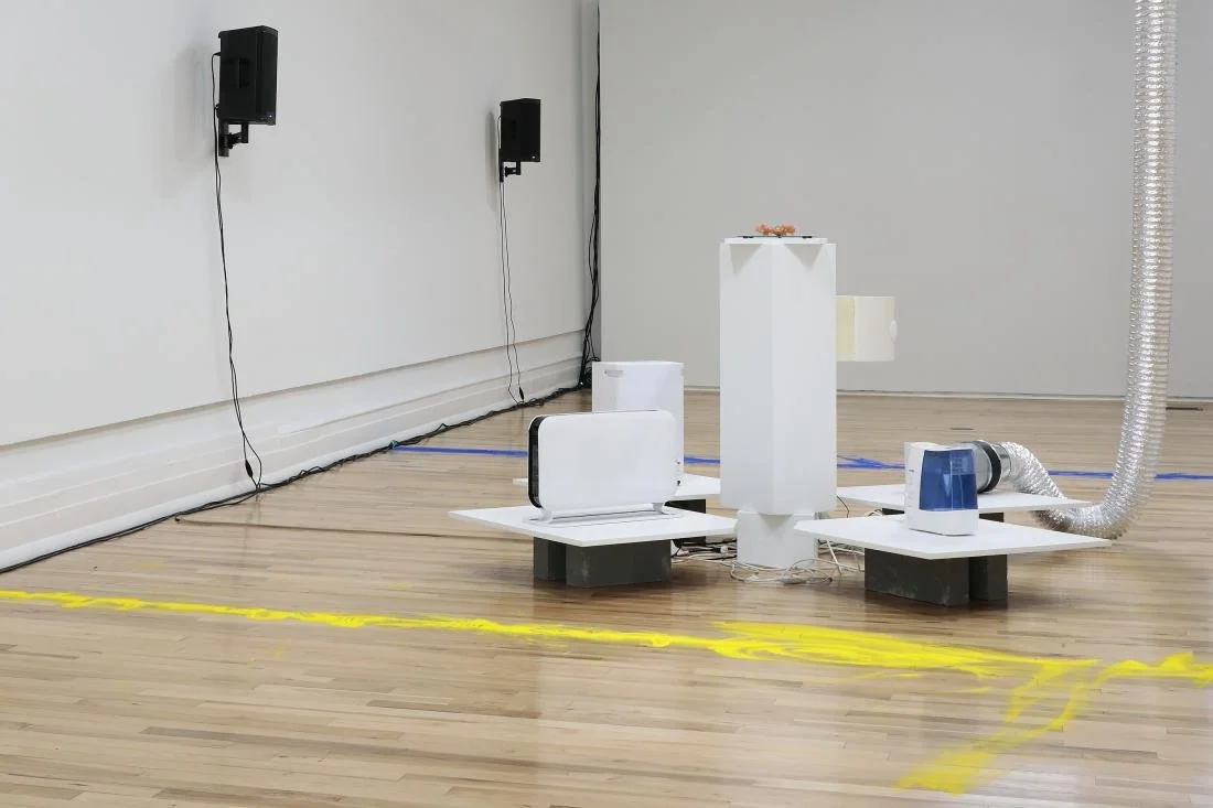 The movement of air exemplifies the myriad of phenomena that arise in natural systems as they exist in a state far from equilibrium—for instance, the automatic regulation of body temperature or the emergence of the vortex of a hurricane. In Interior Weathers, air is an artistic medium and a mediator—it carries meaning as much as it determines the respiratory parameters of one’s ability to experience the exhibition. Museums and galleries usually attempt to nullify fluctuations in weather happening outside, however, Ahmed applies circulation, temperature change, and the molecular phase transitions of air to create a chaotic interior weather system. Ahmed’s use of household machines, pre-existing infrastructure, and sound gesture towards the development of a techno-poetics between the quotidian technological surrounds of modern society and the sublime, ineffable nature of air and wind.
