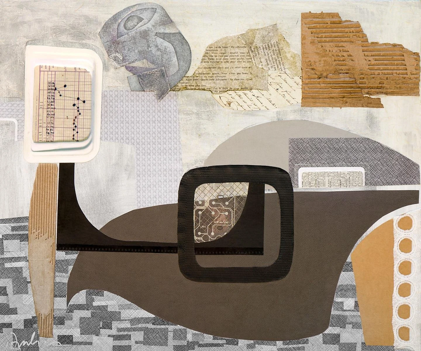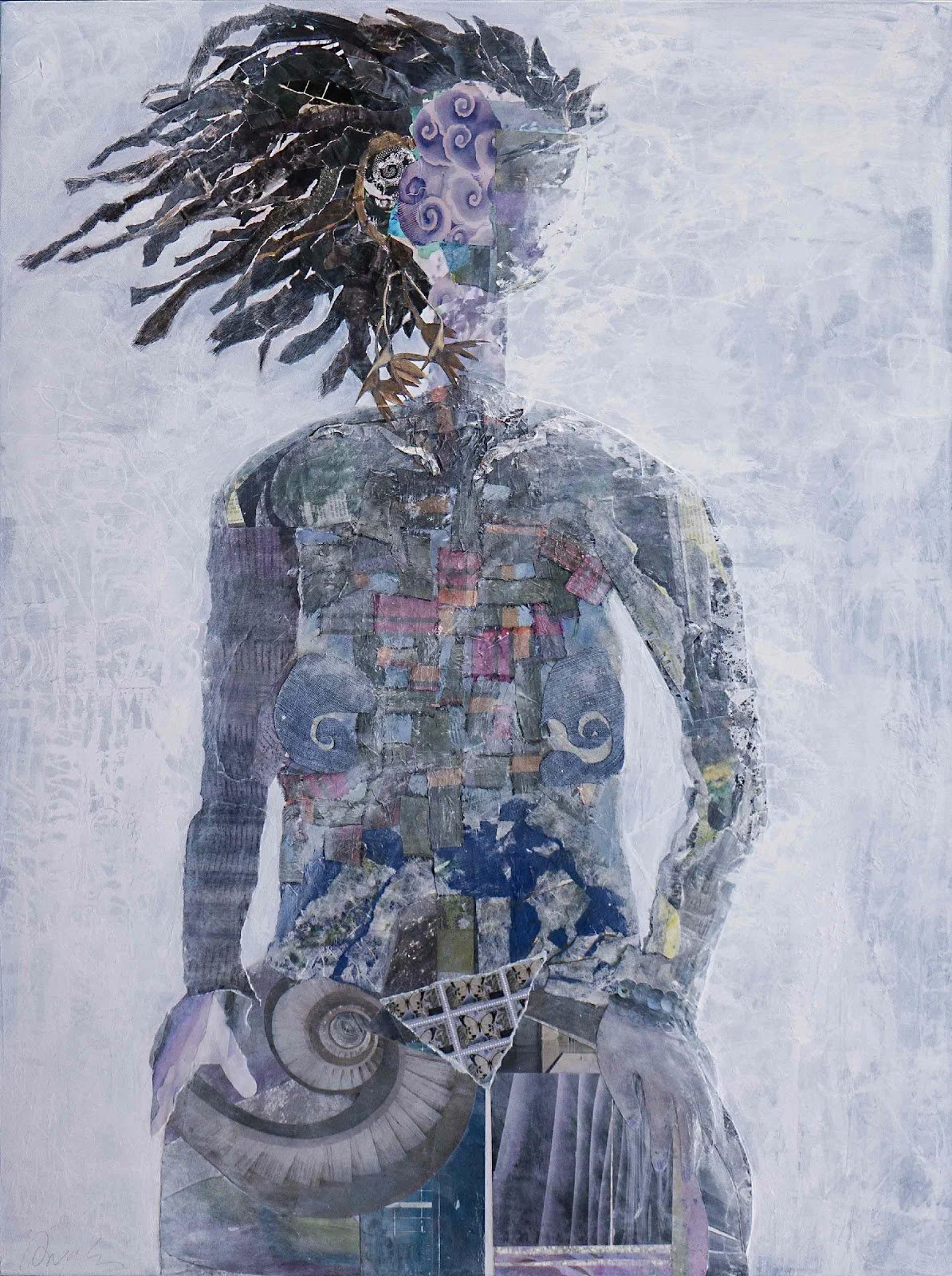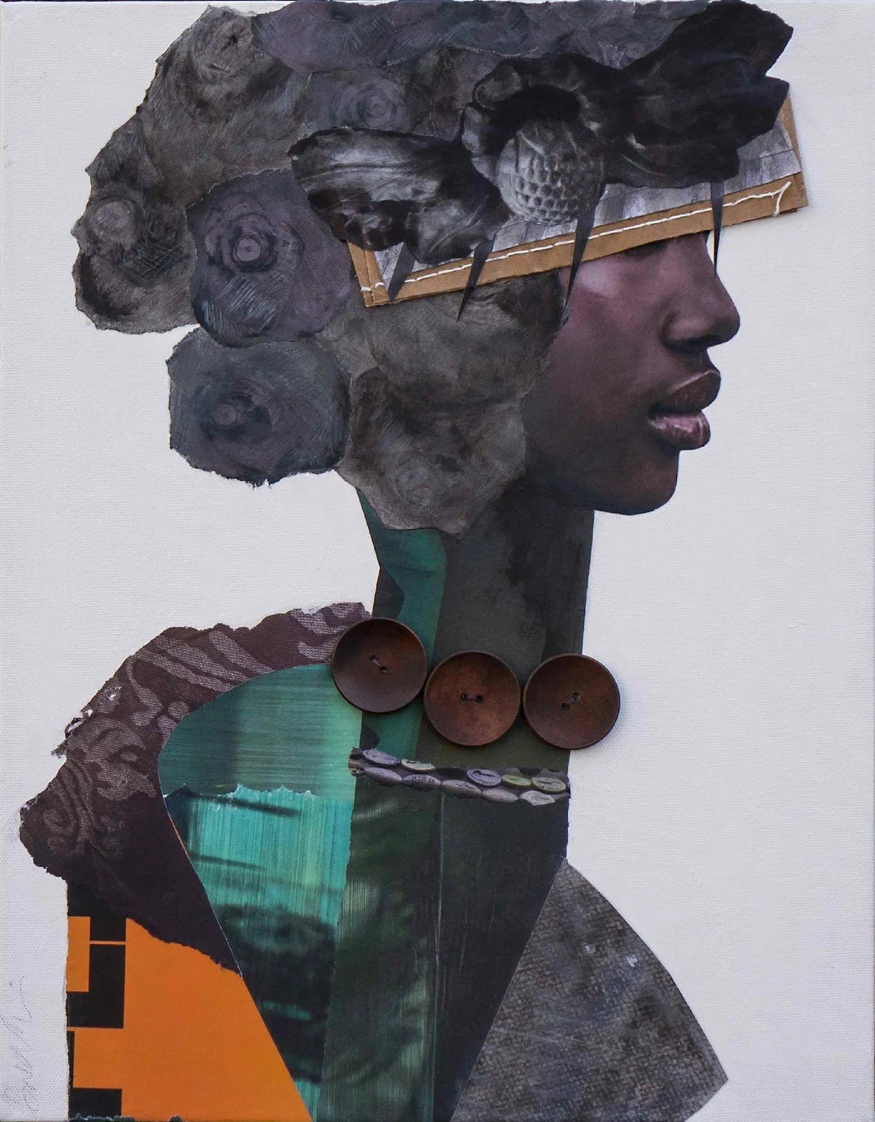 “Influenced by the country’s social instability and racial divide, my paintings are visual narratives on resilience and the fragility of human connections. Through these paintings, I explore injustices and struggles of marginalized people. I see my artwork as a dialogue; an opportunity to awaken sensitivities in others who fail to see the abuse some people encounter daily. Resilience is a theme that reverberates throughout my work and life. I add a distressed texture to illustrate disquieting subject matter symbolic of physical and emotional pain. Black and white letters cut from magazines imply conversations, words hurled at someone. When we fail to acknowledge man’s inhumanity towards others it makes us complicit in their acts.