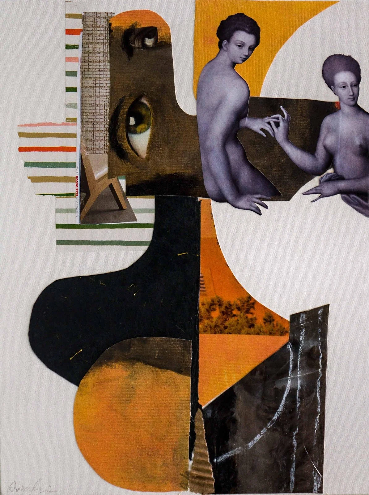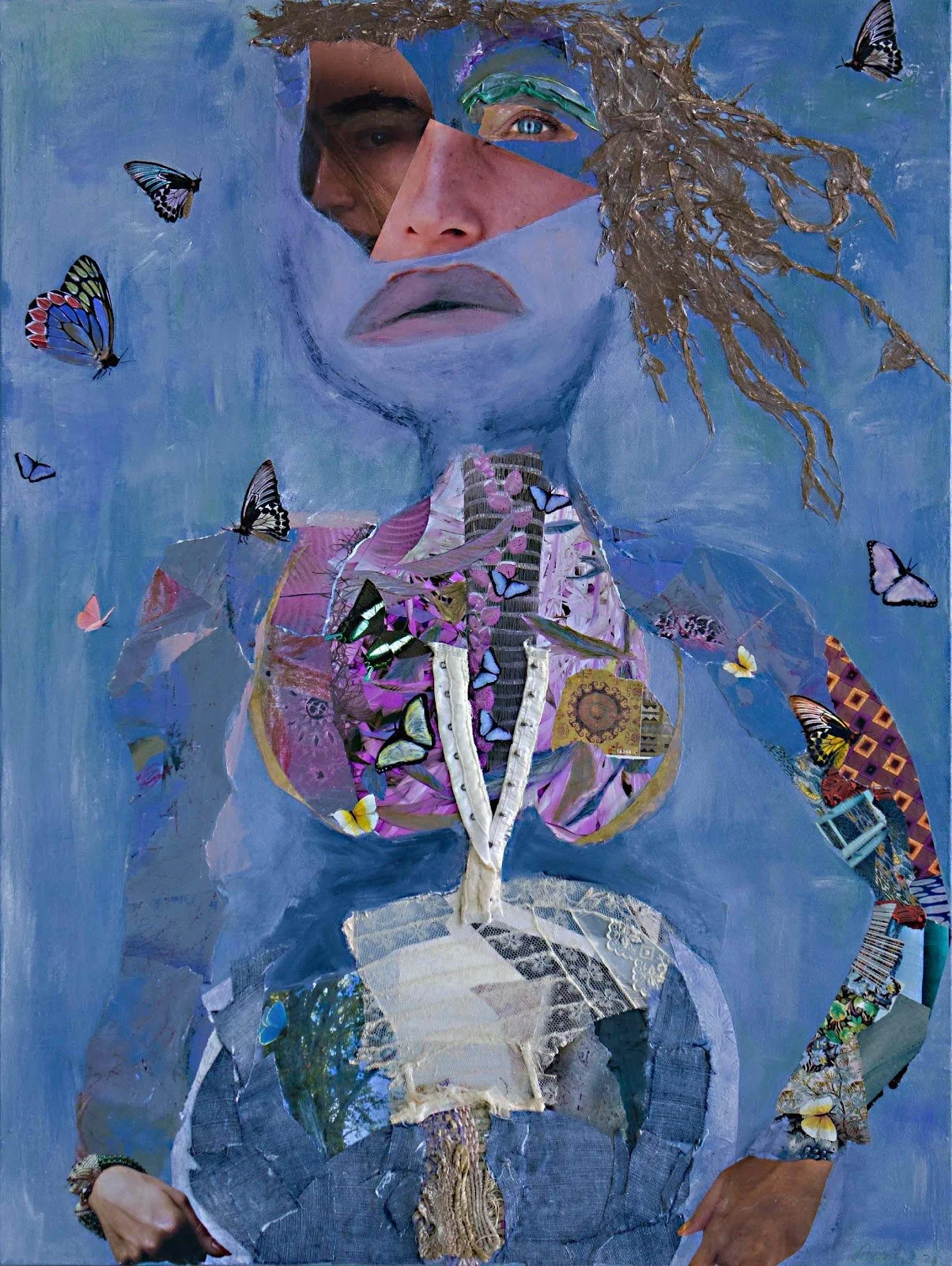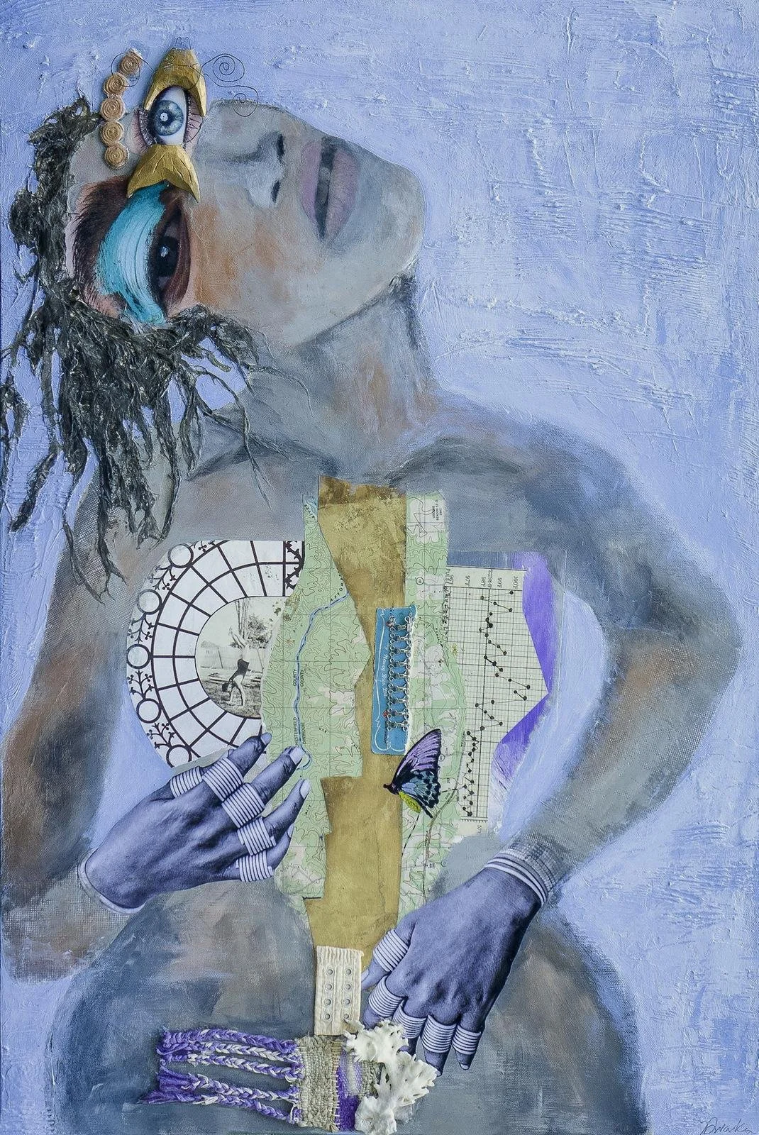 “Elements of race, gender and relationships are portrayed as fragmented and sometimes disparate with recognizable eyes staring back at the viewer. This body of work similarly echoes themes of uncertainty. The current social climate where we are acutely aware of, and often tormented by others, begs us to consider the vast and unknowable potentials of our futures. Incorporating found objects and collected ephemera adds personal context of women’s shared experiences. Artworks with couples represent a time in my life when I questioned my standing in a relationship and the power play of give and take. Painting for me is cathartic, having the opportunity to share my work brings me great joy. Prior to and after heart surgery last year, I created paintings about healing, metamorphosis and resilience; three of those paintings are on view in this exhibition. My most recent figurative and portrait collages began 4 years ago, inspired by Romare Bearden’s mixed media paintings.”