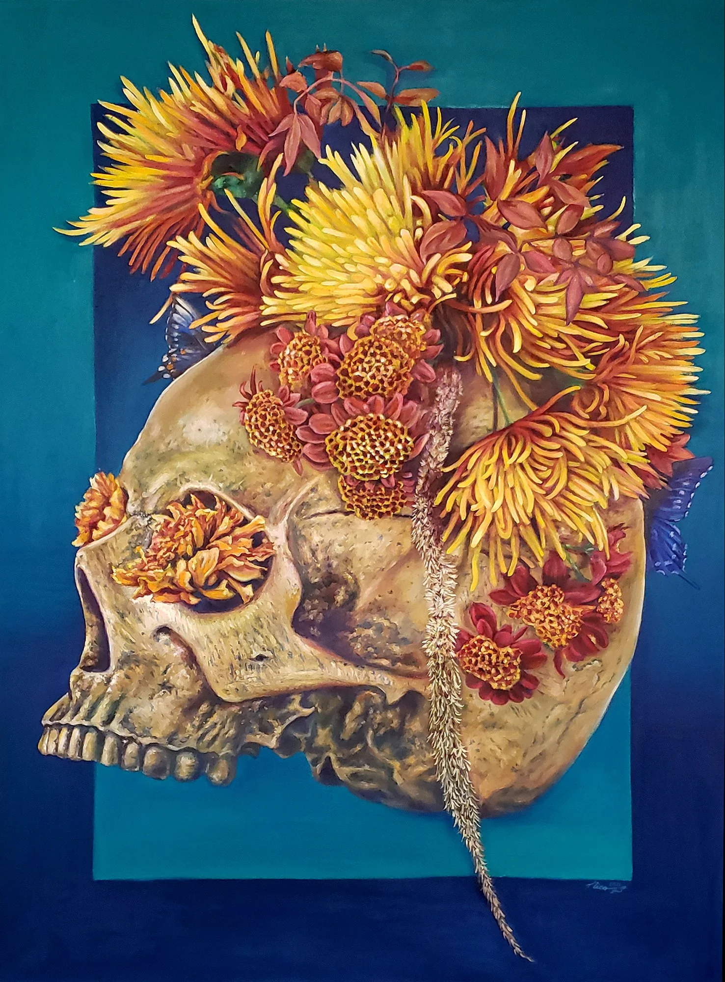 Nico Cathcart is a painter and muralist hailing from Toronto, Ontario, and is currently living in Richmond, Virginia. She strives to discuss intersectional feminism and climate change in her highly-colorful realistic works which often include local flora and fauna, as well as the female form. Her Symbiotic series are canvas works which explore a contemporary take on the traditional memento mori. By crossing the images of skulls with pollinators, sea ice, and ocean level rise, she is asking the viewer to contemplate the connections between themselves, and nature. Her work has been shown at the Virginia Museum of History and Culture, and the Hermitage Museum in Norfolk, as well as galleries across the continent. In 2020, Nico was honored as an Agent of Change for her use of activism in her art by the Virginia Museum of History and Culture, and was the recipient of the 1708 Gallery Space grant. She also was invited to do a TED Talk about the responsibility of public art, and her disability in 2018.