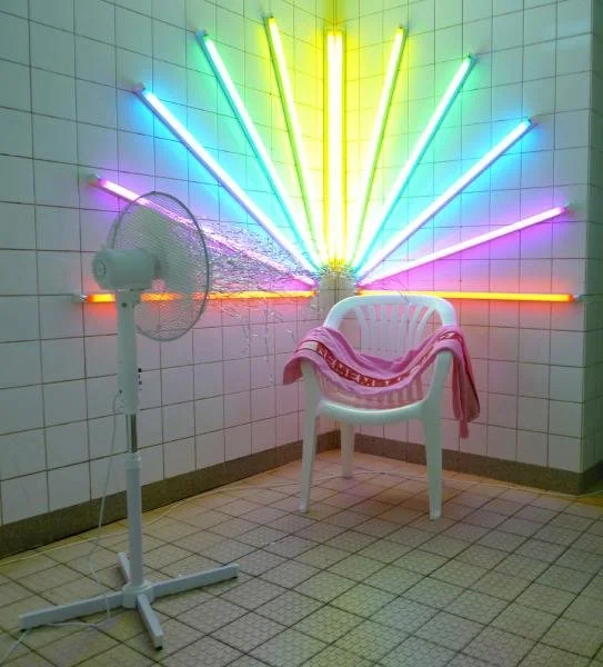 Hüttel’s installations combine neon color, various light fixtures, abstract sculptural elements, found and handmade objects, and mass-produced items in arrangements that suggest cultural, domestic and commercial interior spaces simultaneously. Their presentation implies that these objects are not intended to be interpreted as individual works so much as a matrix of things, illustrating the complex relationships between the assorted objects, light emitting elements, and the architecture of the gallery.