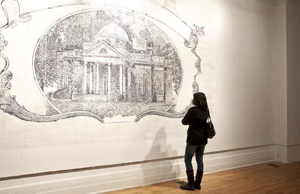 For his exhibition at 1708, Matthew Friday will be constructing an interactive site-specific installation that utilizes the cultural, environmental and economic theories of the third president of the United States, Thomas Jefferson, as means to investigate contemporary social relations. The Liberty of Empire takes the form of a provisional laboratory and the first stage of this project involves interviews with local citizens concerning their beliefs regarding what should be included in the archive of history. This information will be collected and fed into a specially designed java-script program that interprets the future and past tense as a set of fractal attractors/resistors and creates a set of vector diagrams. Friday will then create a large-scale, site-specific ink wash mural based upon Thomas Jefferson’s architectural plans for Monticello. Using a workstation that is part of the exhibit, the diagrams are printed onto sheets of velum and placed onto a corresponding section of the mural. During the course of the exhibition, drawings will slowly accumulate, obscuring the mural.