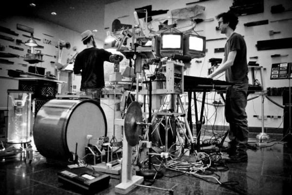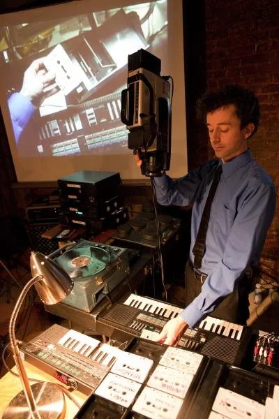 Invisible’s performances—noted for their use of experimental musical instruments, or sound sculptures—explore connections between sound, noise, music, video, technology, identity, obsolescence and the human body. They play one-of-a-kind instruments in performances alongside video, found sound, electronics and conventional instruments. Their current work, The New Obsolete, features the Selectric Piano, a typewriter that electromechanically controls a piano, and Elsewhere’s Roof, a drip-driven drum machine. Data projectors, Commodore64 monitors, and multiple VHS and cassette decks tap the End-User Archive, Invisible’s folk library of scrounged sound and video samples. Inherent in the scale and peculiarity of this densely-layered performance is the potential for the same viewer to have multiple different experiences of The New Obsolete from one night to the next, despite its precisely calculated format.