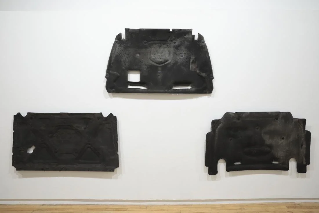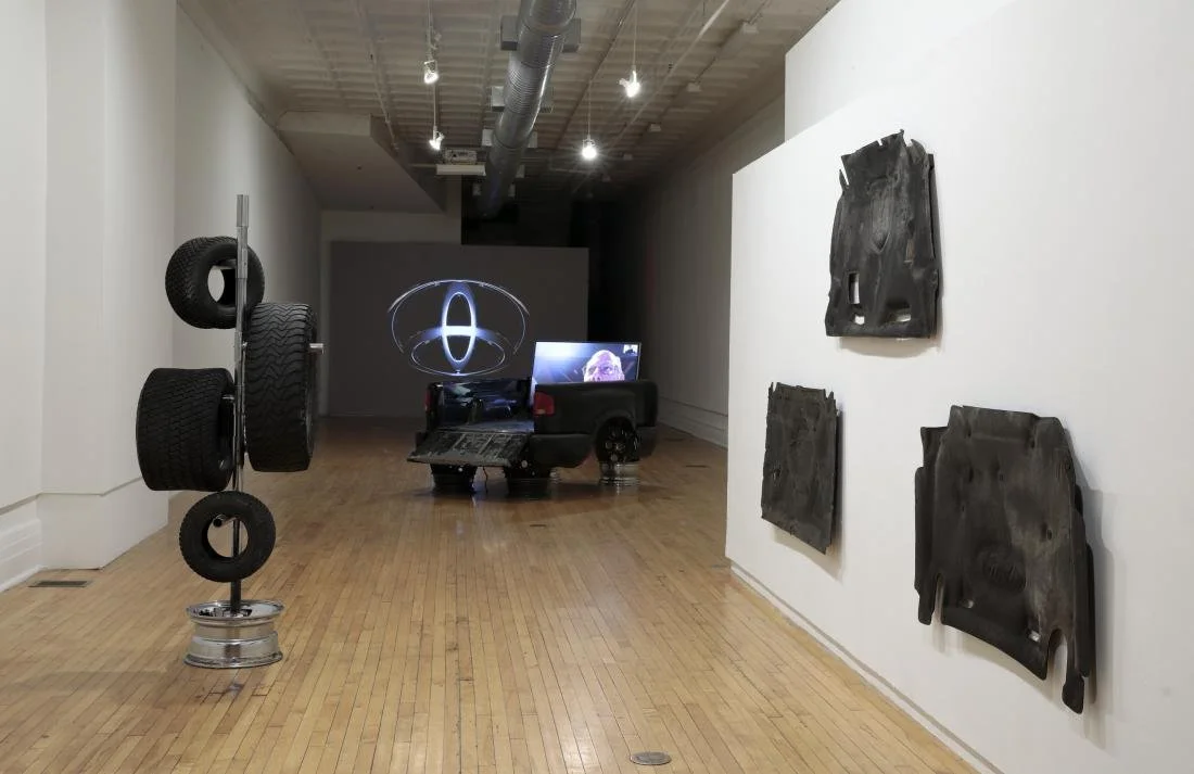 1708 Gallery announces Deepwater Horizon, an exhibition of sculpture, video, and appropriated objects by Belgian artist Xavier Mary. Deepwater Horizon borrows its name from an ultra-deepwater offshore oil rig that, while one of the deepest rigs ever drilled, culminated in the most catastrophic explosion and oil spill in U.S. history. Sculptures arduously drag from dilapidated industrial material –truck beds, insulation, soot, wheels– a retrospective capture of automotive dysfunction and material memory. These objects become small structures to consider the near future of the fossil fuel industry and societal upheaval underway. Flames in Kuwait engulf the reflected surface of a simulated, inverted Toyota emblem in projection. A geologist expounds upon complicity, speculation, risk, and indifference in a video from the back of a pickup truck. And memorabilia exemplify the hysterical collapse of subject and object in automotive entertainment lore.